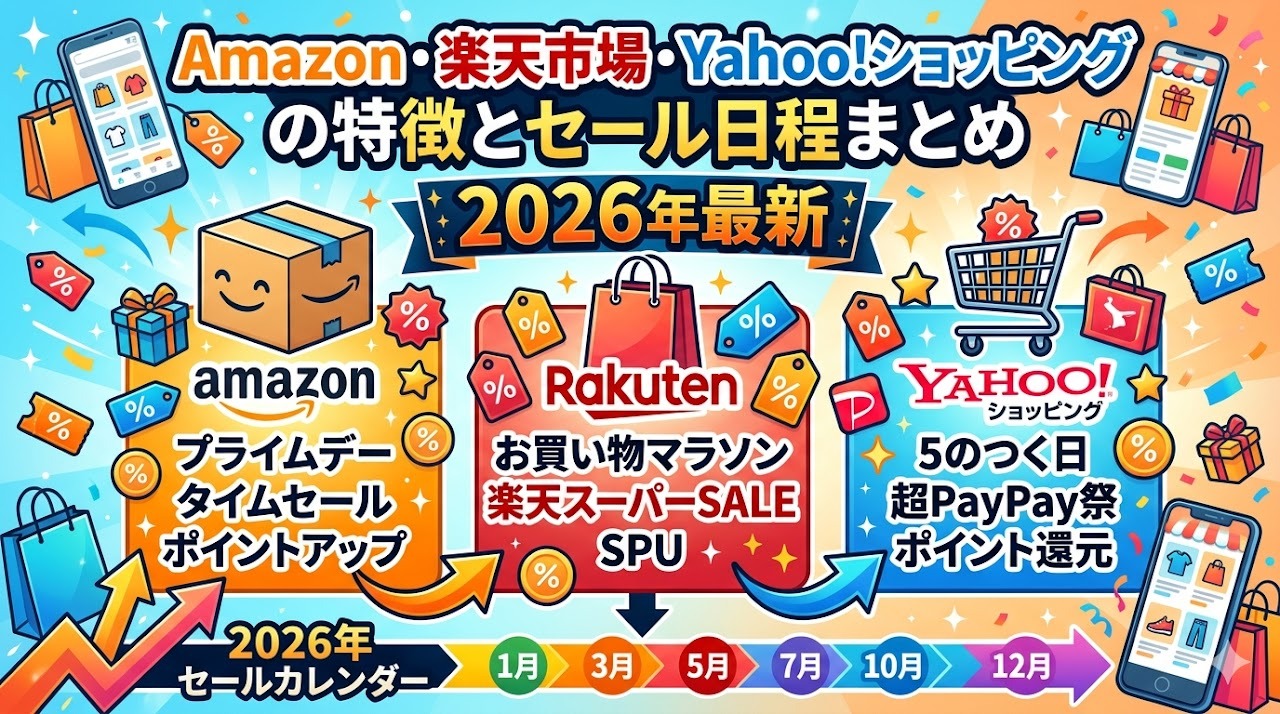 Amazon・楽天市場・Yahoo!ショッピングのセール、どこで買えば一番お得なのか迷ったことはありませんか?この記事では2026年の年間セールカレンダーと各サービスの特徴・攻略法を徹底比較します。