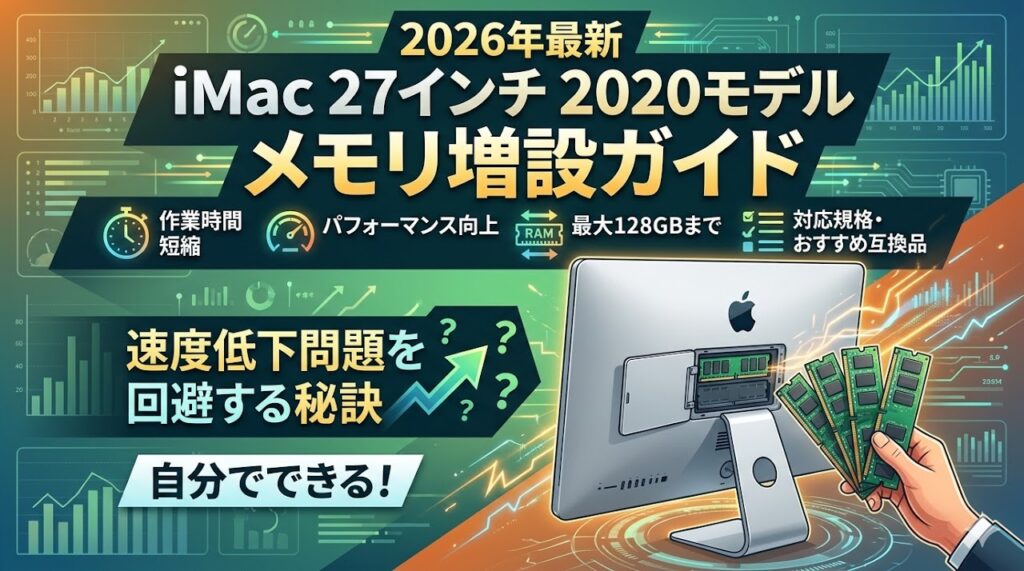 iMac 27インチ 2020年モデルのメモリ自己増設は、Apple公式オプションより大幅に安く済みます。対応メモリの仕様・おすすめ互換品・増設時の注意点(2133MHzになる問題)を解説します。 iMac 27インチ 2020年モデルのメモリ仕様 iMac(Retina 5K、27インチ...